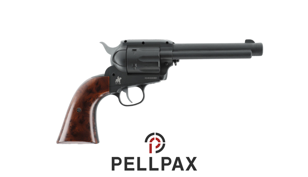 With its matte black finish and wood-style grip panels, the revolver captures the rugged charm of the Old West while maintaining the reliability of modern CO₂ engineering. The single-action trigger delivers a crisp, responsive feel, while the sliding safety ensures secure operation.