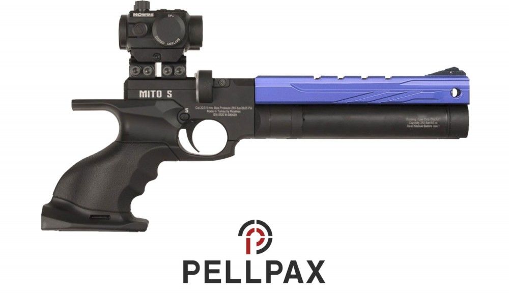 The Mito from Reximex is a PCP air pistol that comes supplied with a shoulder stock (only on synthetic models) . The pistol features an ambidextrous palm rest. This palm rest is easy to hold and allows each shot to be controlled and accurate. Coming in either synthetic or walunt.