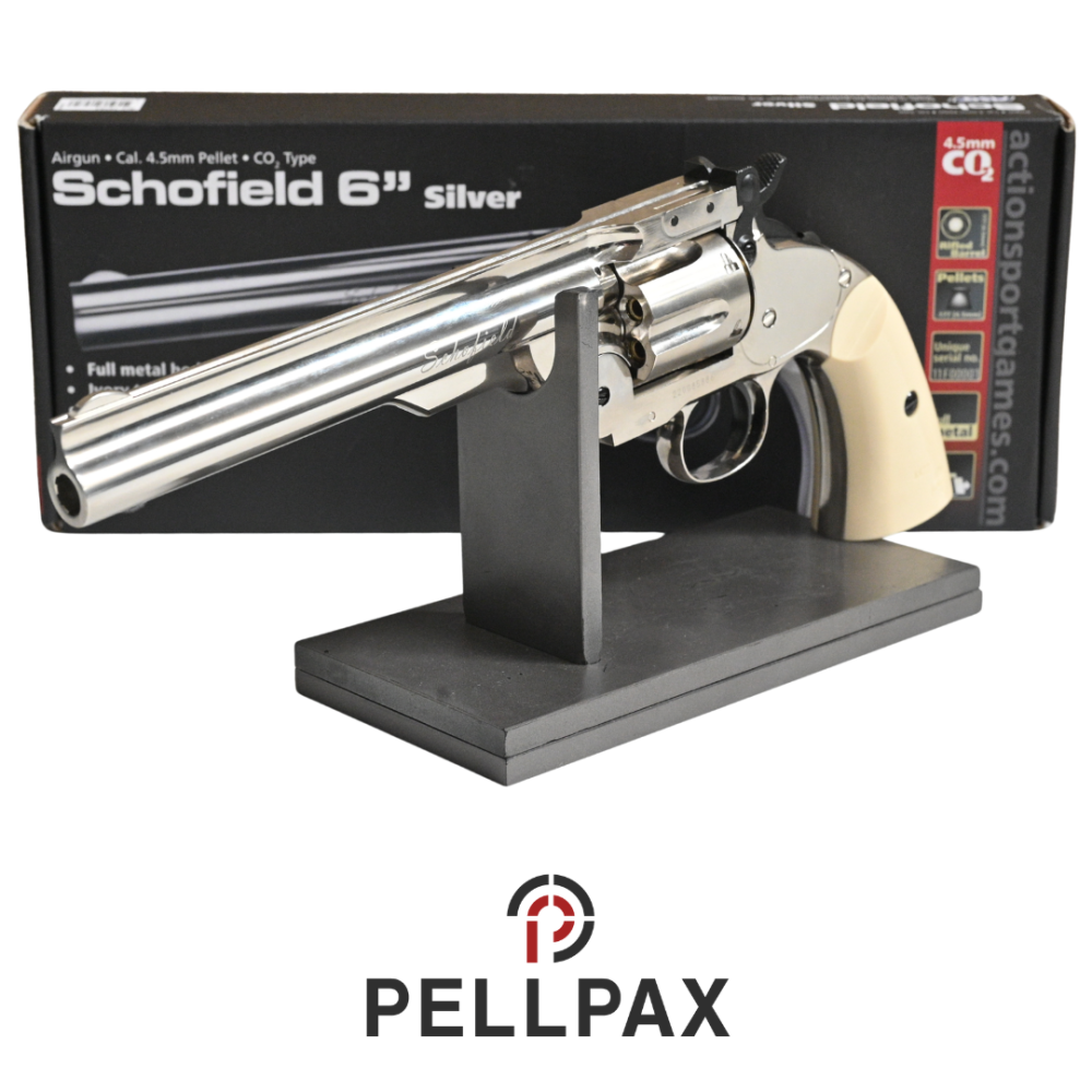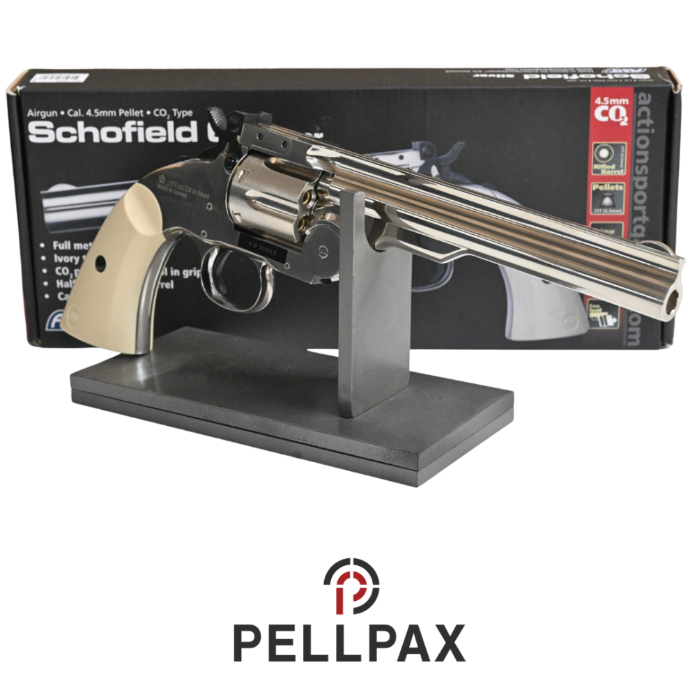 This preowned ASG Schofield 6 Revolver Silver w/ Ivory Grips is a .177 Pellet calibre air pistol within an Original Box. This pistol is in great condition with minor usage marks.