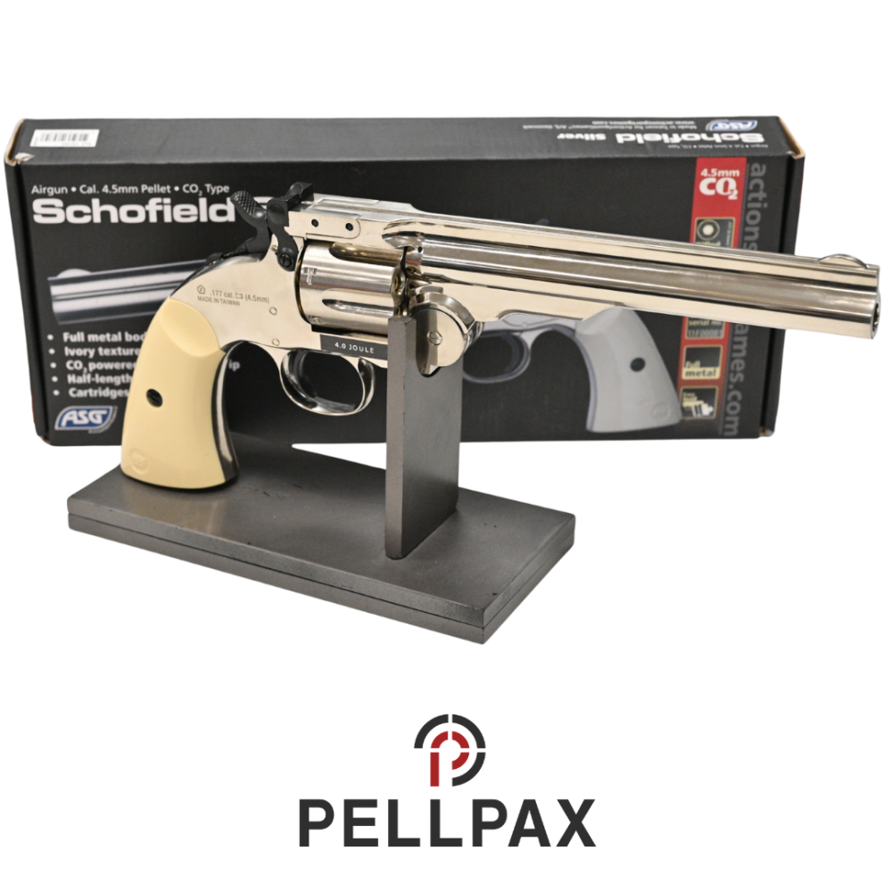 This preowned ASG Schofield 6 Revolver Silver w/ Ivory Grips is a .177 Pellet calibre air pistol within an Original Box. This pistol is in great condition with minor usage marks.