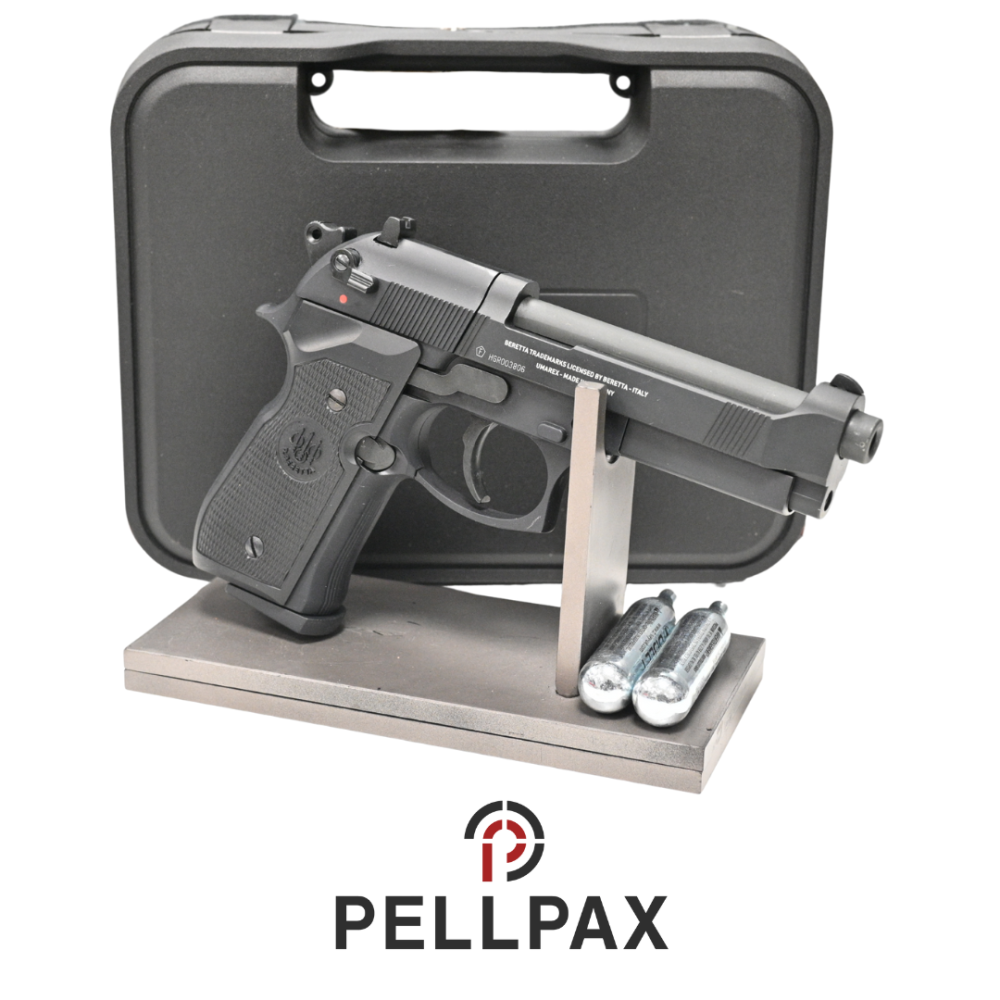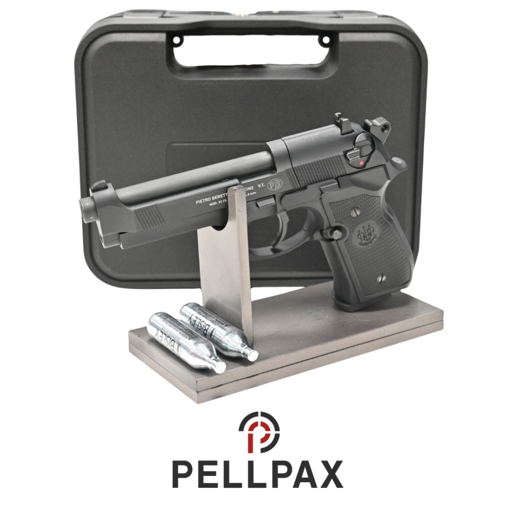 This preowned Beretta M92FS Black is a .177 Pellet calibre air pistol within an Hardcase. This pistol is in great condition with minor usage marks.