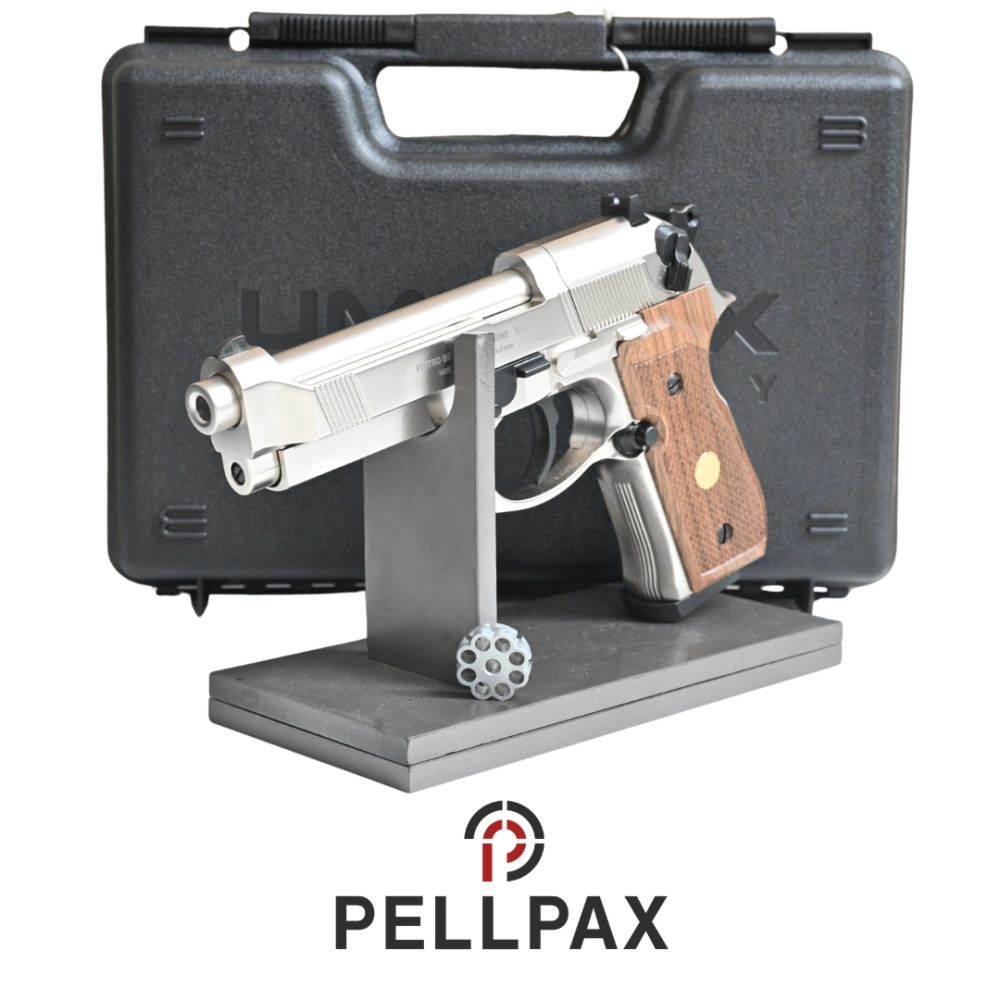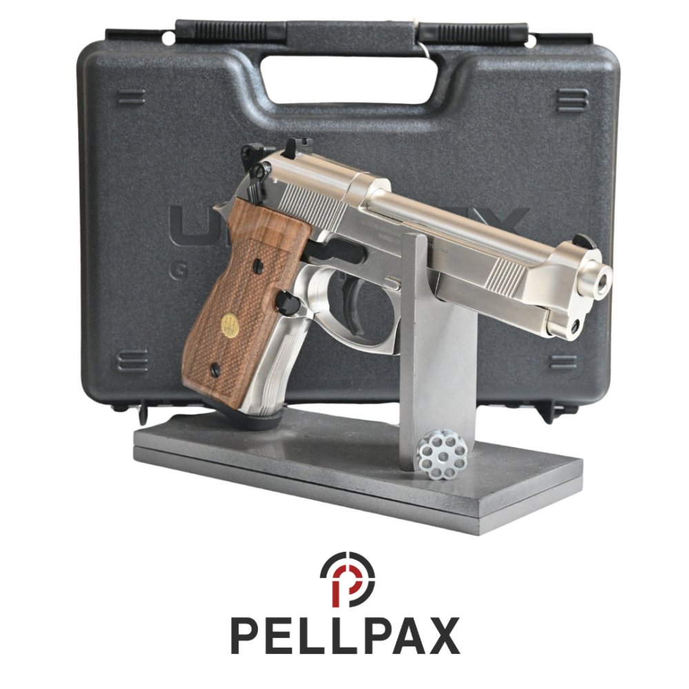 This preowned Beretta M92FS Nickel (Wood grips) is a .177 Pellet calibre air pistol within an Original Box. This pistol is in great condition with minor usage marks.
