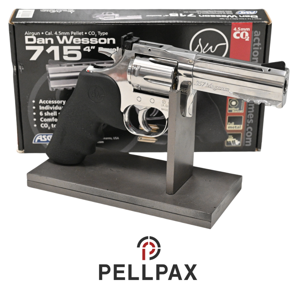 This preowned Dan Wesson 715 Silver - 4" is a .177 Pellet calibre air pistol within an Original Box . This pistol is in great condition with minor usage marks.