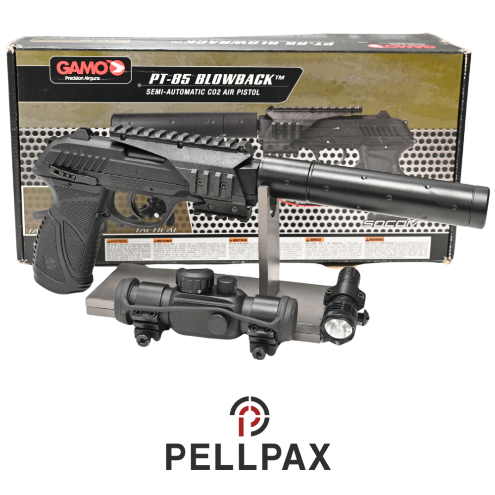 This preowned Gamo PT-85 Tactical is a .177 Pellet calibre air pistol within an Original Box . This pistol is in great condition with minor usage marks.