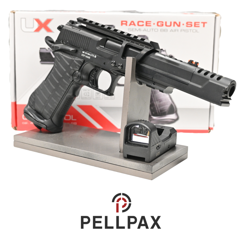 This preowned UX Race Gun kit is a 4.5mm Steel BB calibre air pistol within an Original Box . This pistol is in great condition with minor usage marks.