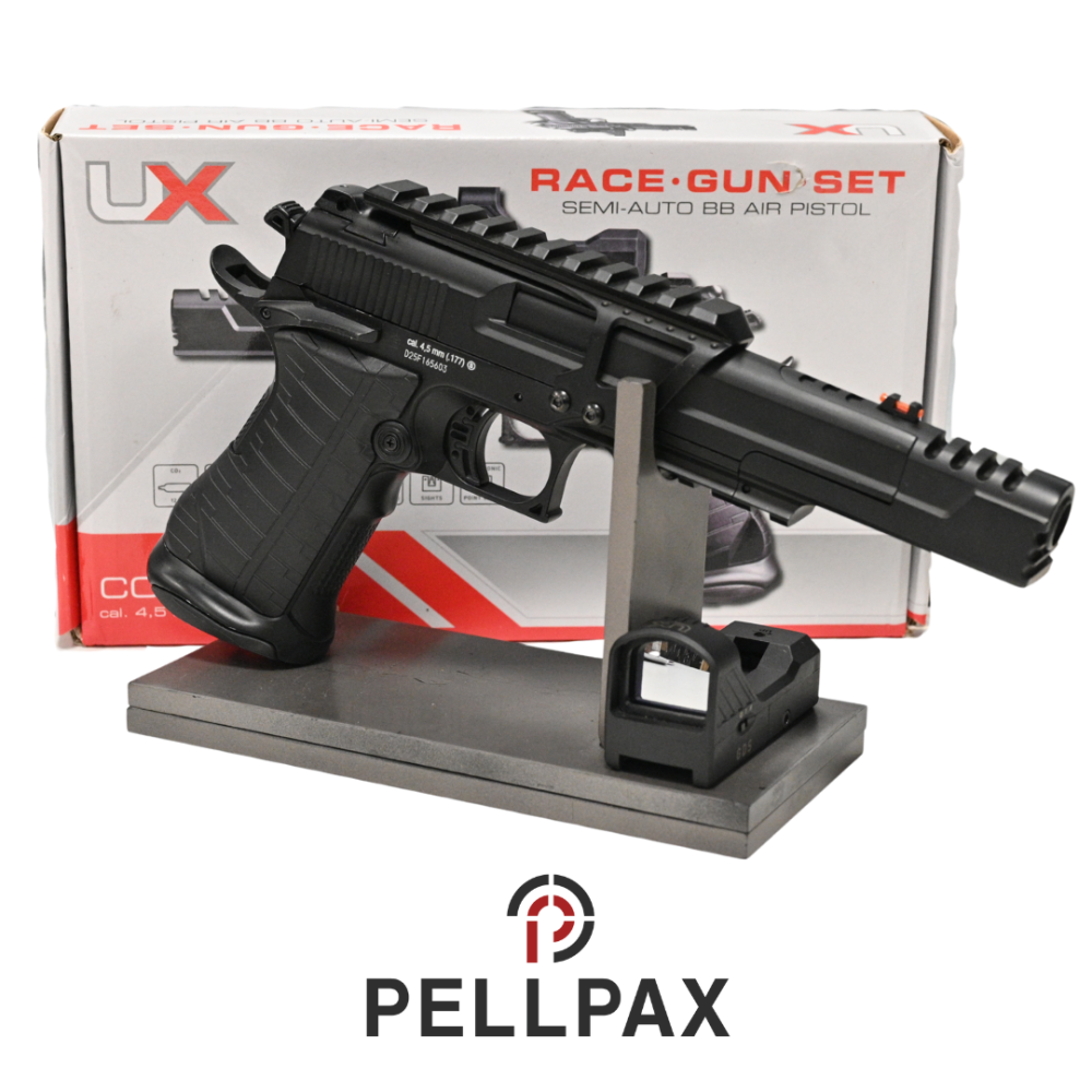 This preowned UX Race Gun Kit is a 4.5mm Steel BB calibre air pistol within an Original Box . This pistol is in great condition with minor usage marks.