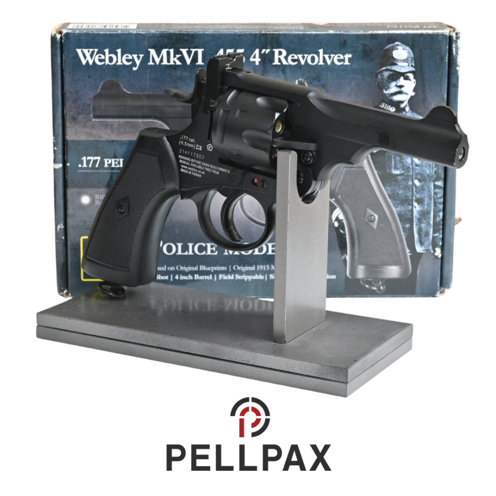 This preowned Webley MKIV 4 Inch Black is a .177 Pellet calibre air pistol within an Original Box. This pistol is in great condition with minor usage marks.