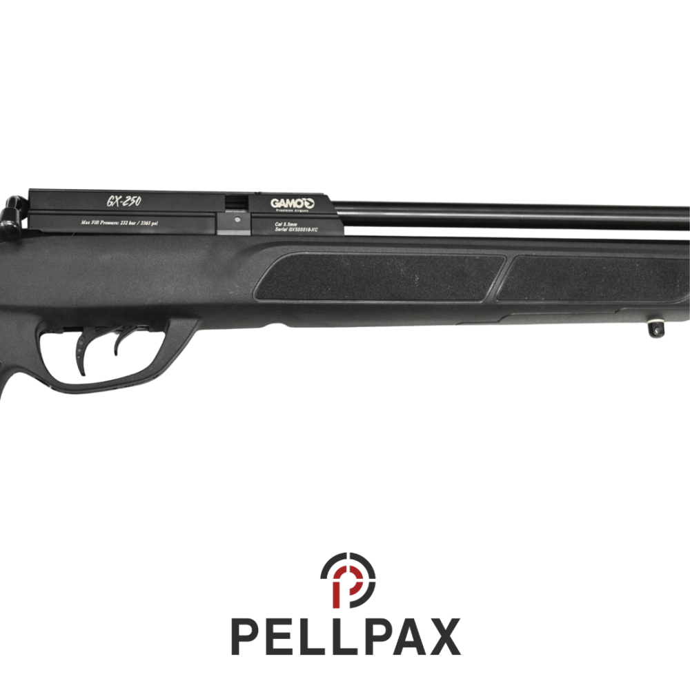 This preowned Gamo GX-250 is a .22 calibre air rifle within an Pellpax Gunbag . This rifle is in great condition with minor usage marks.
