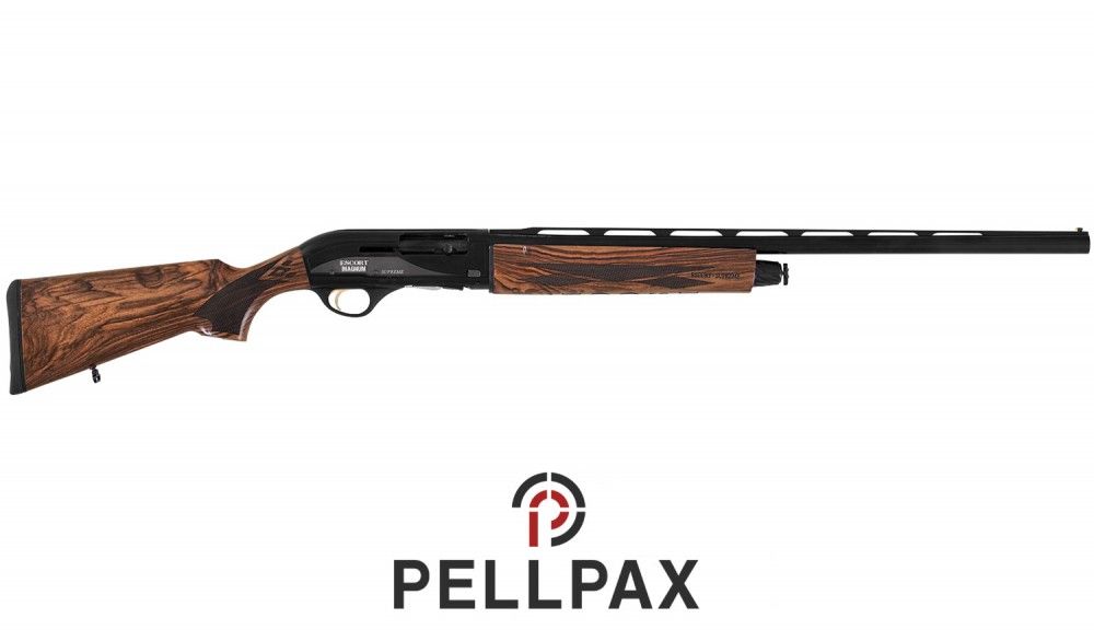 The Hatsan Escort Supreme 12 gauge is a high-quality shotgun designed for hunting and shooting sports. It features a sleek, black synthetic stock with ergonomic grip and forend, which provides a comfortable and stable shooting platform.